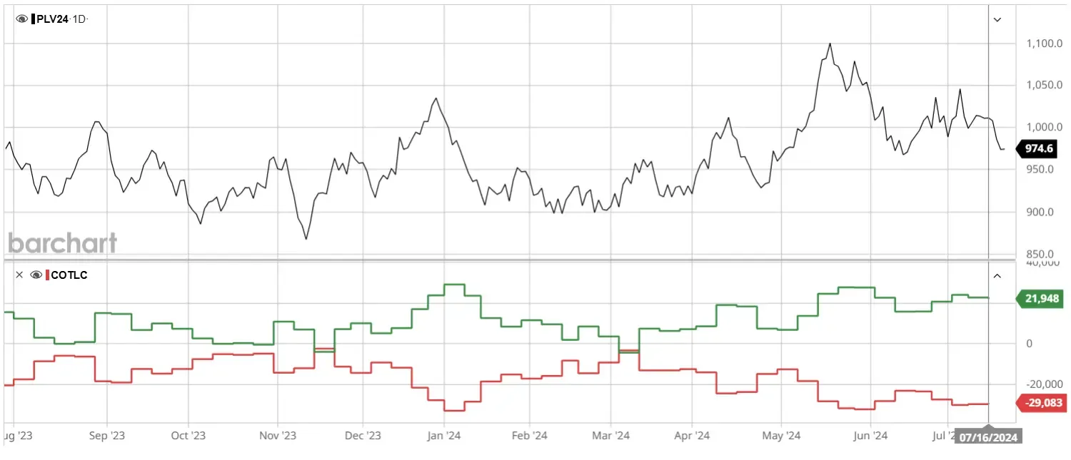 Vị thế COT (Commitments of Traders) tới ngày 16/7: Dữ liệu COT cho thấy sự gia tăng trong các vị thế Mua và Bán của các nhà đầu cơ, tuy nhiên ngày 17/7 chính là ngày bạch kim tạo đỉnh và sụt giảm 7%. Do đó cho thấy số lượng vị thế bán tăng mạnh, vị thế mua giảm mạnh. Chệnh lệch vị thế của Nhóm Thương mại lớn, với số lượng vị thế Bán vẫn ở mức cao.